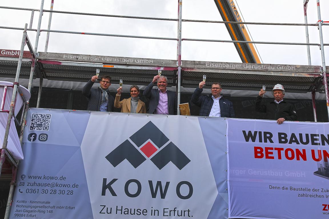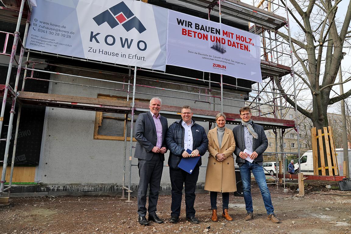 Gemeinsam für unsere Kita - v.l. Oberbürgermeister von Erfurt Andreas Bausewein, KoWo Geschäftsführer Alexander Hilge, AWO Bereichsleiterin Miriam Trautwein und Daniel Keller, Leiter Stabsbereich Technische Innendienste bei Züblin AG