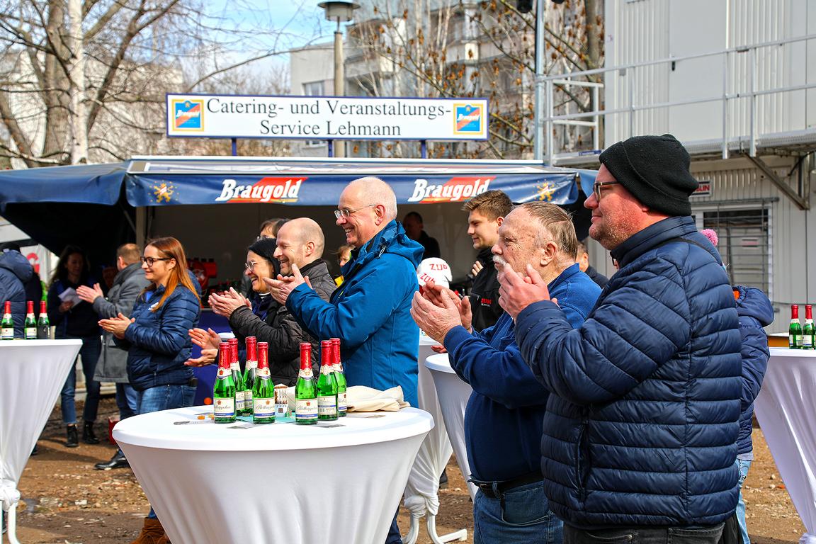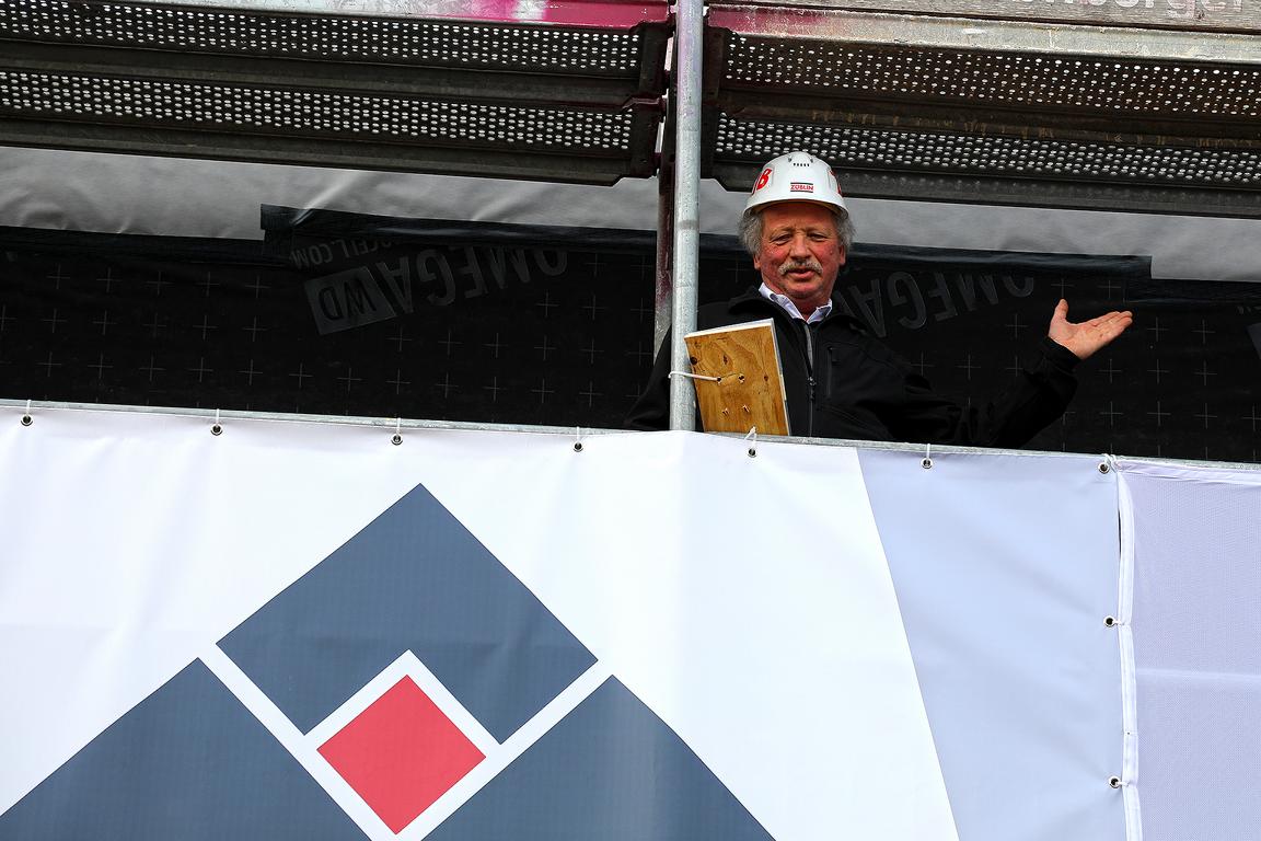 Mittels traditionellen Richtspruch wünscht uns der Polier Matthias Helbig vom Generalunternehmen Züblin AG viel Glück für das Bauprojekt.
