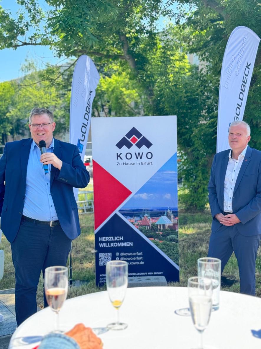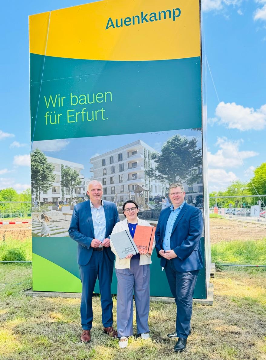 v. l.: Oberbürgermeister der Stadt Erfurt Andreas Bausewein, Niederlassungsleiterin Bestands-und Wohngebäude Erfurt bei GOLDBECK Group Johanna Lindenlaub und KoWo Geschäftsführer Alexander Hilge
